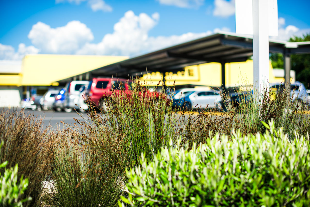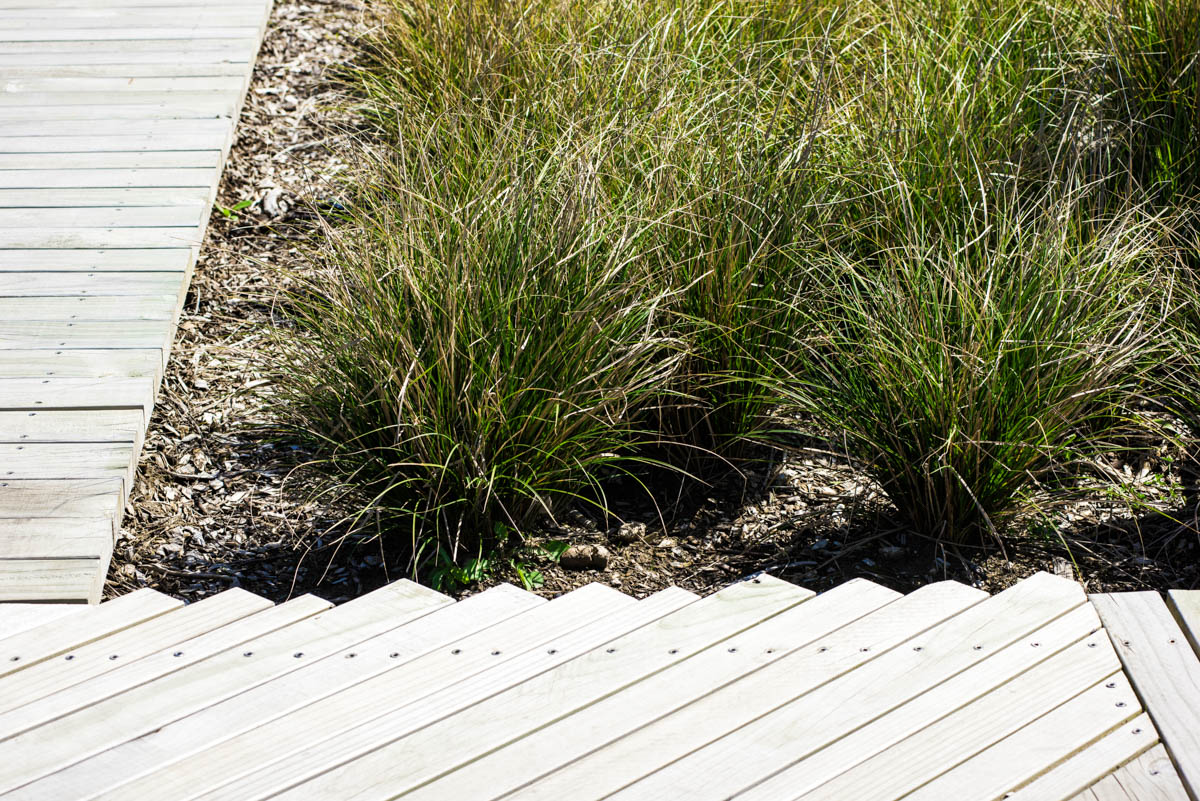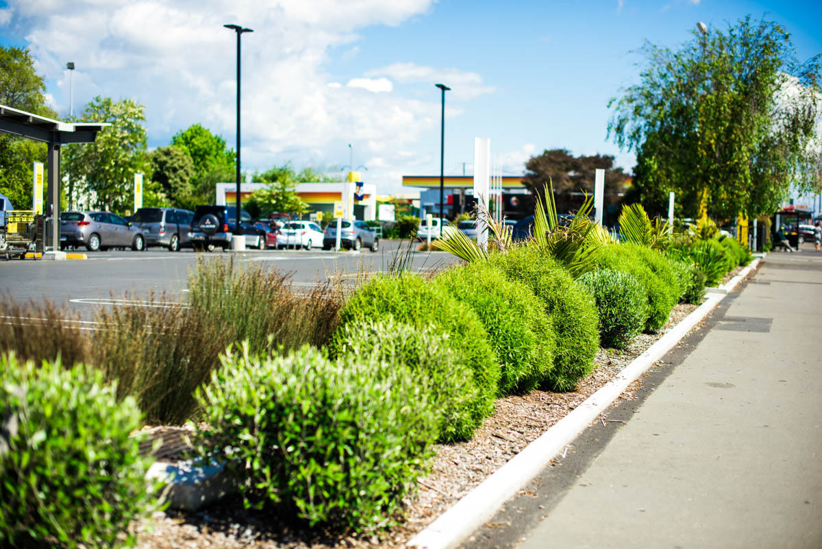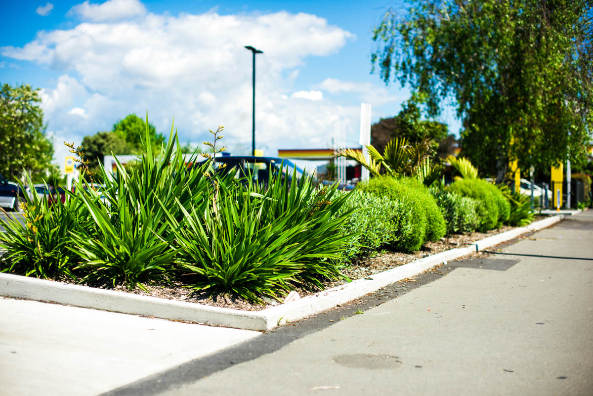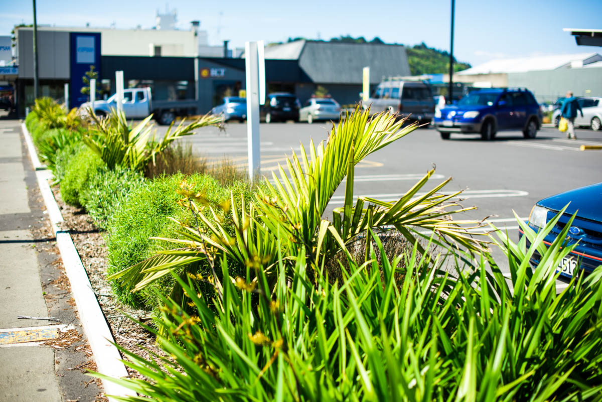 Use of NZ plants to soften and endure a commercial space. Plant selection by Fulton Hogan, planted by TreeGen.